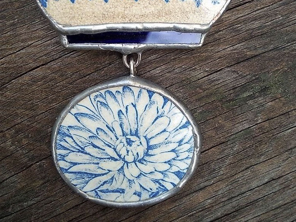 Теперь и у меня есть медаль из осколков антикварной фарфоровой посуды (во всём виновата, понятно, Катя Симонова). Попытка сформулировать, в чём для меня заключается обаяние этих украшений, напоминала погоню за давно знакомой, но ускользающей мелодией. Перебирала в памяти одно, другое. Нашла-таки цитату из «Других берегов» Набокова: «Были похожие на леденцы зеленые, розовые, синие стеклышки, вылизанные волной, и черные камешки с белой перевязью, и раковинки, распадающиеся на две створки, и кусочки глиняной посуды, еще сохранившие цвет и глазурь: эти осколки он приносил нам для оценки, и, если на них были синие шевроны или клеверный крап или любые другие блестящие эмблемы, они с легким звоном опускались в игрушечное ведро. Не сомневаюсь, что между этими слегка вогнутыми ивернями майолики был и такой кусочек, на котором узорный бордюр как раз продолжал, как в вырезной картинке, узор кусочка, который я нашел в 1903-ем году на том же берегу, и эти два осколка продолжали узор третьего, который на том же самом Ментонском пляже моя мать нашла в 1885- ом году, и четвертого, найденного ее матерью сто лет тому назад, — и так далее, так что если б можно было собрать всю эту серию глиняных осколков, сложилась бы из них целиком чаша, разбитая итальянским ребенком Бог весть, где и когда, но теперь починенная при помощи этих бронзовых скрепок».