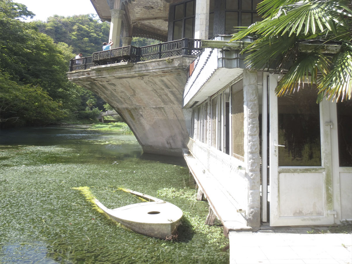Я и теперь затрудняюсь определить по шкале «зелёный-бирюзовый» цвет той воды, сквозь которую просматривались на мелководье, ближе к берегу, тени больших рыб. Опять же: мы наблюдали щедро залитую светом картину пруда с аллеи, не менее щедро, чуть не до сумерек, накрытую буйной абхазской растительностью. Фотоаппарат здесь без вспышки не брал. И беззаботная беззубая старушка, торгующая соком «фейхуя», как было указано у неё на картонке, навсегда получилась смазанной в недрах его цифровой памяти. В отличие от нависающего над дальним углом пруда в роскошном послеполуденном блеске павильона-пагоды. Но как же я была разочарована вечером, когда рассматривала то, что получилось: моя мыльница почти не уловила чудесной ауры этого странного места.