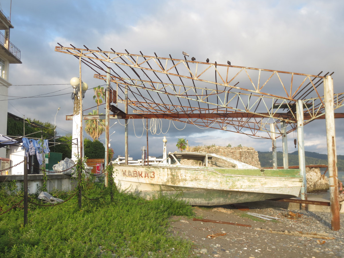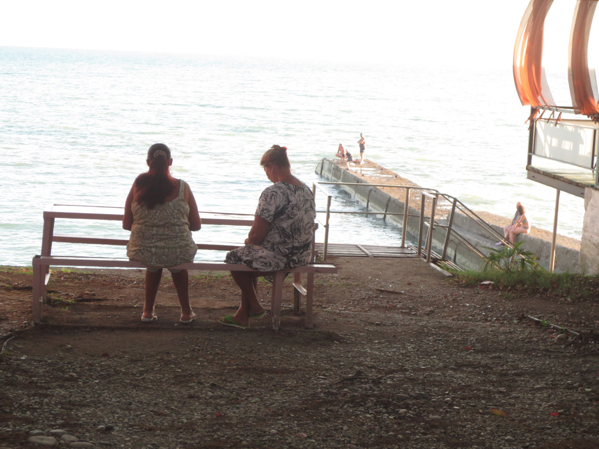 Мы забрались сюда в поисках тени, облюбовав заброшенную, уходящую в море метров на 40, пристань. Судя по экстерьеру, её построили в 60-х годах прошлого века. Значит, для Хрущева (вверху, за шоссе, сразу две дачи — Хрущева и Сталина). А здесь, среди бетонных основ, можно затаиться в прохладе и тихонько наблюдать за жизнью вокруг.
