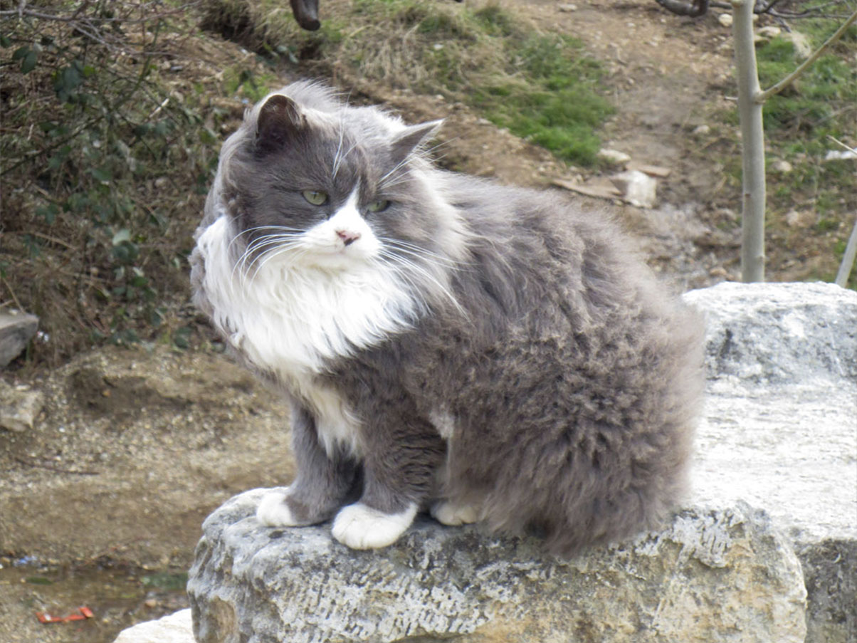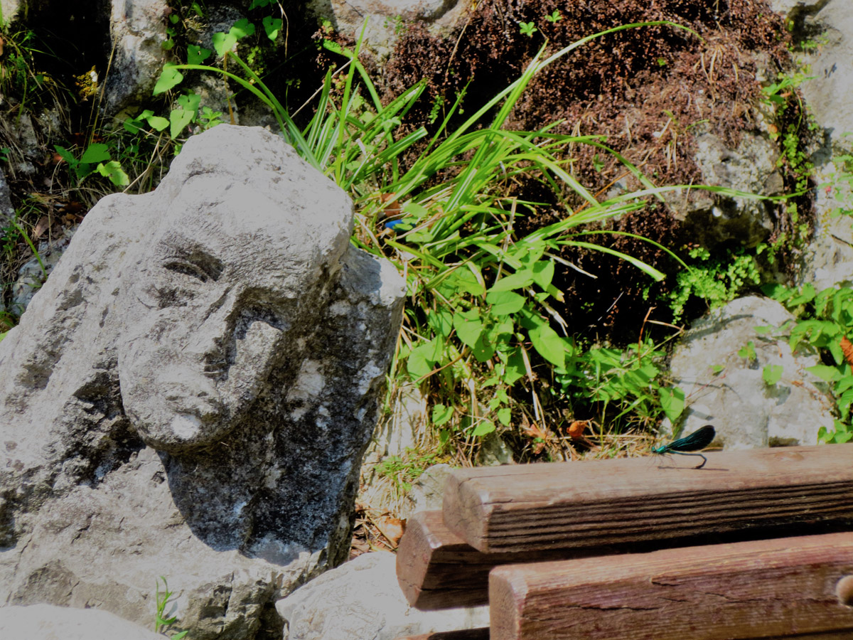 Железнодорожную платформу «Псырцха», под крышей затейливого павильона которой ржавеет вывеска её непроизносимого на русском имени, мы нашли случайно. Последовали даже не за отдыхающими, троп которых всегда сторонились, а за изумрудными стрекозами. Они вились у самого парапета смотровой площадки, откуда туристы обычно любуются Новоафонским водопадом. Одна из них, преследуемая моим фотоаппаратом, и заманила нас к началу лестницы, ведущей вверх, к гребню водосливной плотины, замыкающей панораму небольшой площади. Стрекоза растаяла в самом начале тенистой аллеи, идущей вдоль пруда-водохранилища, но на прощание так ослепила промельком своих сине-зелёных с металлическим отливом крыльев, будто предупреждала, что сейчас начнётся урок по колористике.