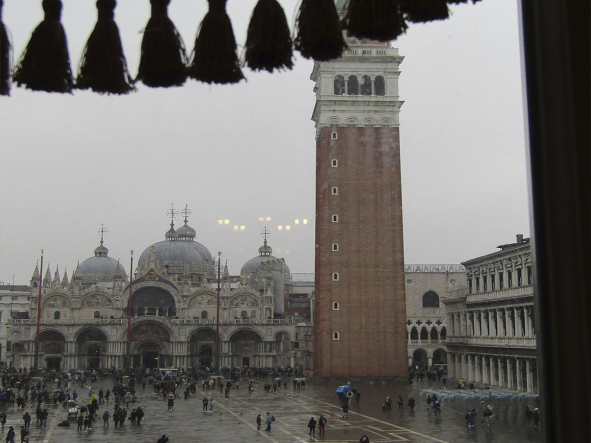Постепенно я начала развлекаться, фотографируя виды из окон музея, воображая, что там у меня полотна, обрамлённые вместо рам драпировками штор (где пышными, а где нет). Дождь, зарядивший с утра, был не способен до конца разогнать туристов с площади Сан-Марко.